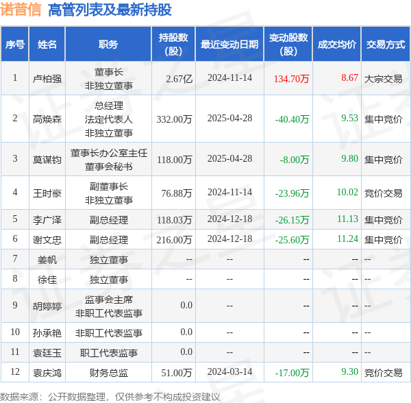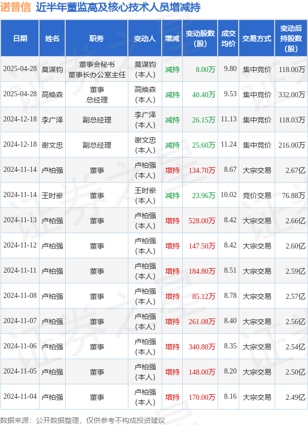 诺普信近半年内的董监高及核心技术人员增减持详情如下: